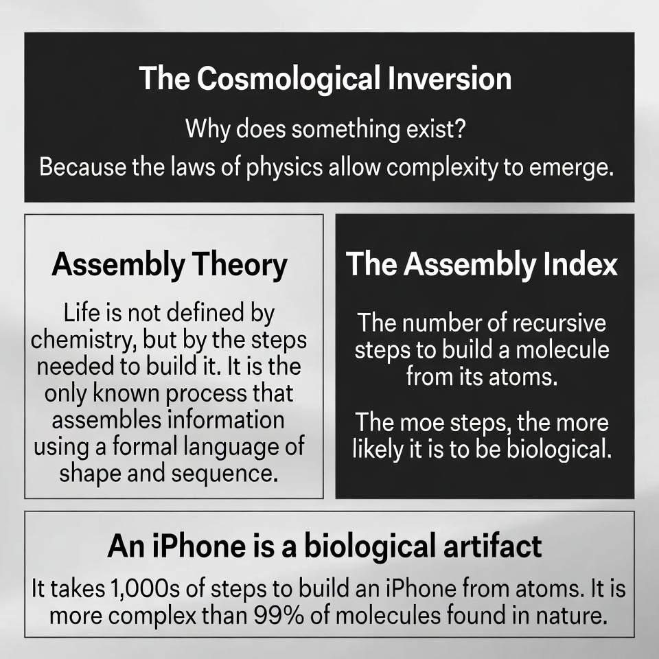 In perhaps his most provocative comparison, Cronin argues that an iPhone is “life.” While we see it as a piece of technology, Assembly Theory views it as a biological artifact. An iPhone cannot be formed by the random collision of atoms in a vacuum, even over trillions of years. Its existence requires a four-billion-year unbroken chain of biological evolution, culminating in a specific designer (the human mind) and a global manufacturing infrastructure. The iPhone is the physical manifestation of a massive amount of “causal history.” By this definition, our technology is not separate from life; it is the current “high-water mark” of the biosphere’s complexity.