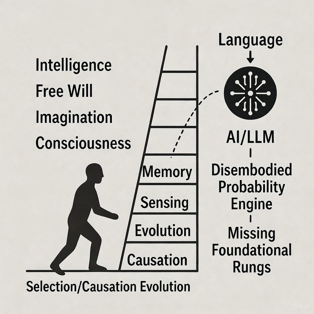 Cronin notes that LLMs like GPT-4 start at the very top of this ladder Language without having any of the foundational rungs (Evolution, Sensing, Agency). Because they lack the drive for survival and the capacity for sensing the physical world, they are “disembodied probability engines” rather than intelligent agents.